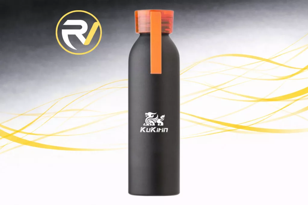 KuKirin fém kulacs gravírozott logóval. Matt fekete fém ház, gumi/műanyag narancssárga kupakkal.